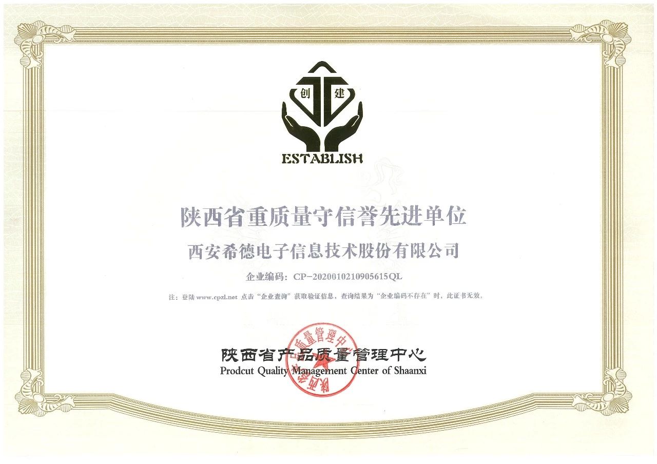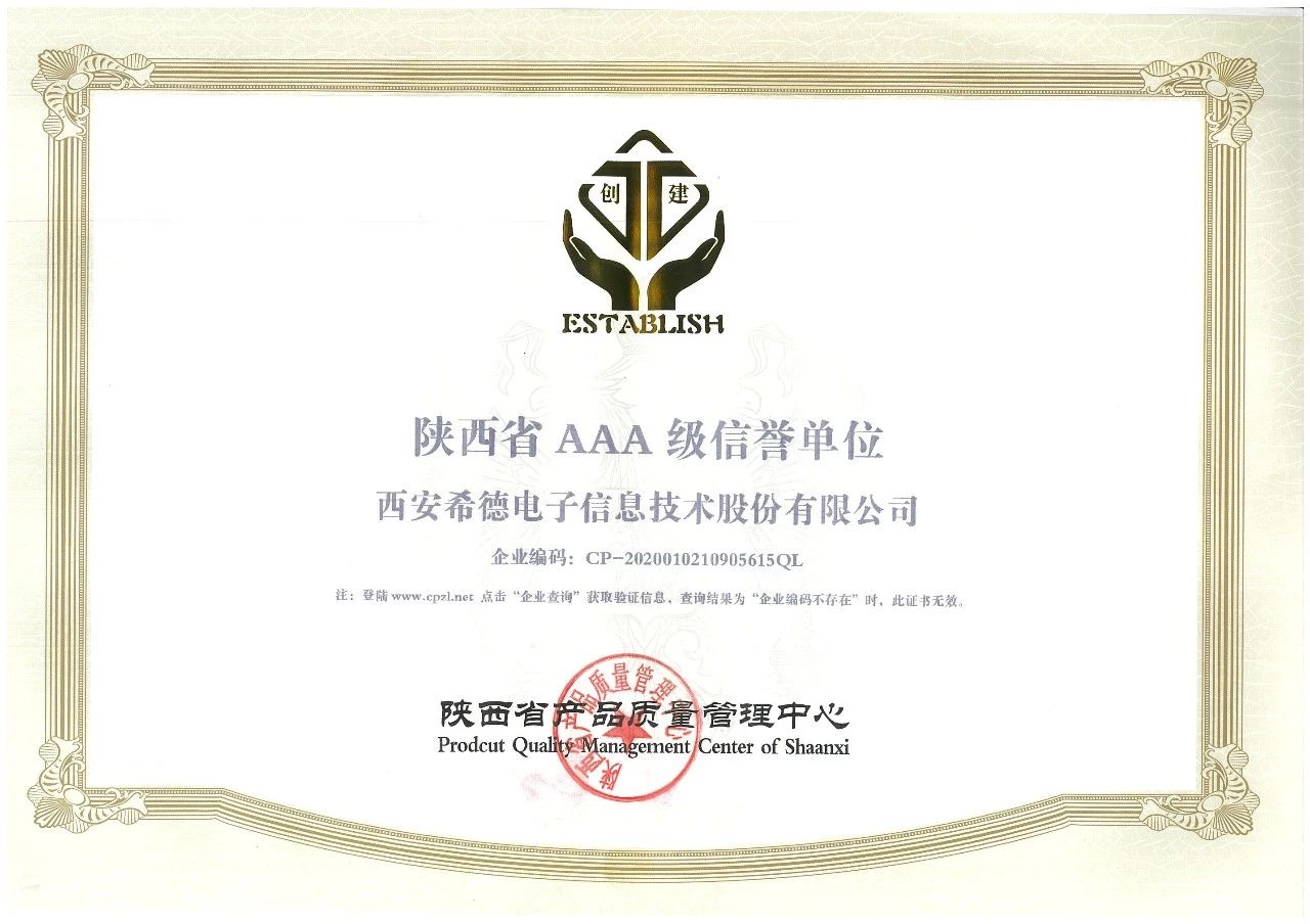 希德電(diàn)子(zǐ)再獲“陝西(xī)省AAA$α級信用(yòng)單位”和(hé)“陝西(xī)省重質 ✘量守信譽先進單位“殊榮